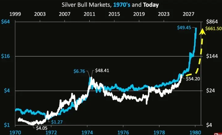 Синий график показывает стоимость серебра с 1970 года по 1980 год (синяя шкала слева и снизу). Белый график показывает стоимость серебра с 1999 по 2025 год (белая шкала справа и сверху). Жёлтая пунктирная линия показывает какой цифры могла бы достичь стоимость серебра, если бы повторилась история с братьями Хант в настоящее время.