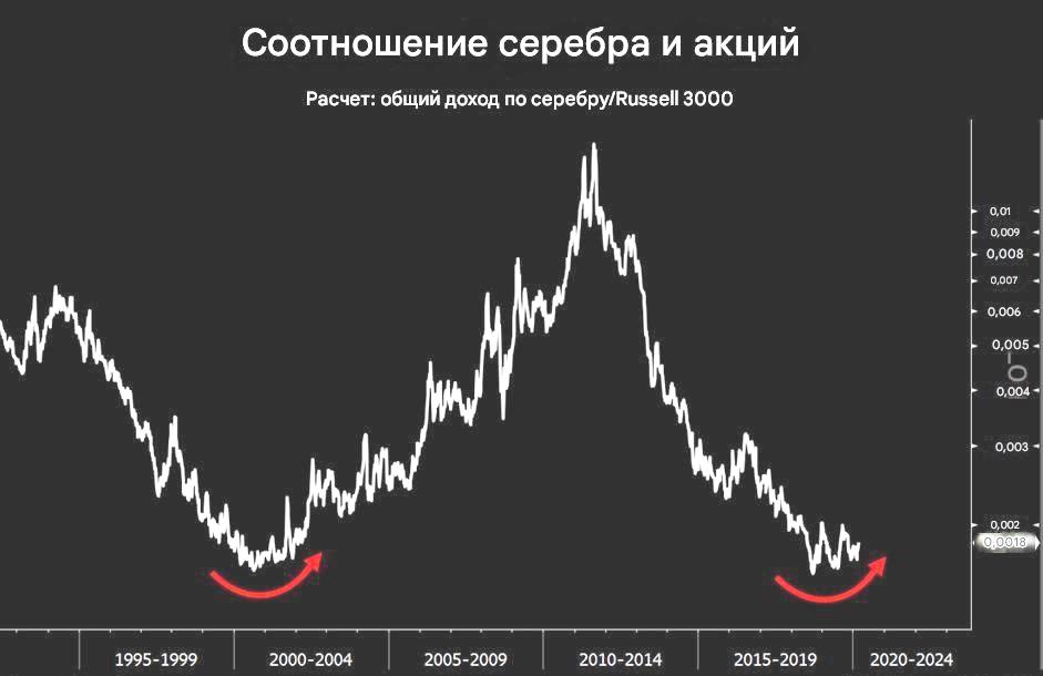 График строится путём деления цены на унцию серебра на значение индекса Russell 3000. Russell 3000 отслеживает 3000 крупнейших американских компаний, составляющих до 98% фондового рынка США.